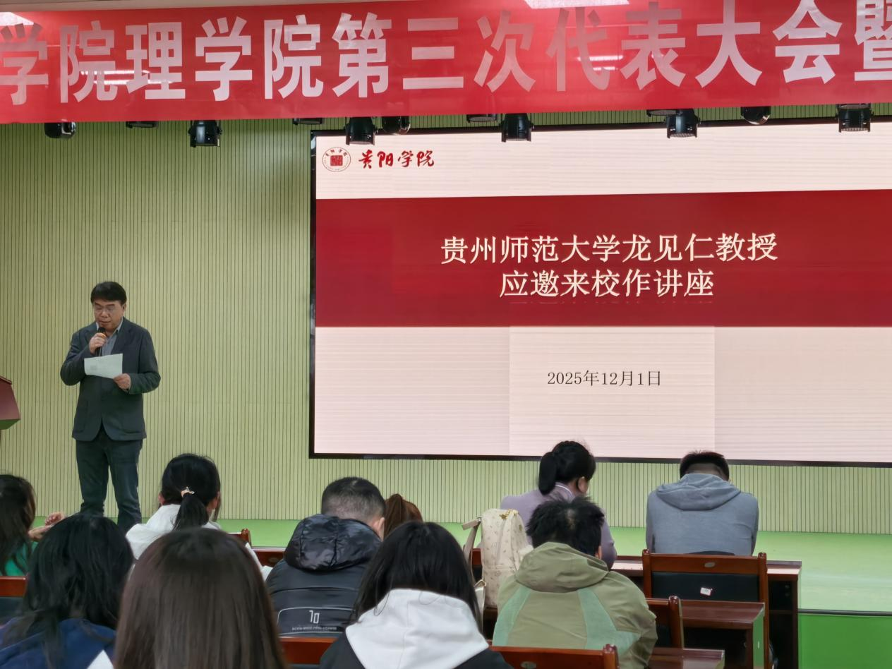 2025年12月1日,贵州师范大学数学科学学院龙见仁教授应我院彭长文教授邀请在贵阳学院理学院开展讲座。活动于理学院七楼多功能教室举行,贵阳学院理学院顾大刚院长主持开场,邹茜副院长出席活动,学院近130名数学与应用数学专业学生参与聆听。